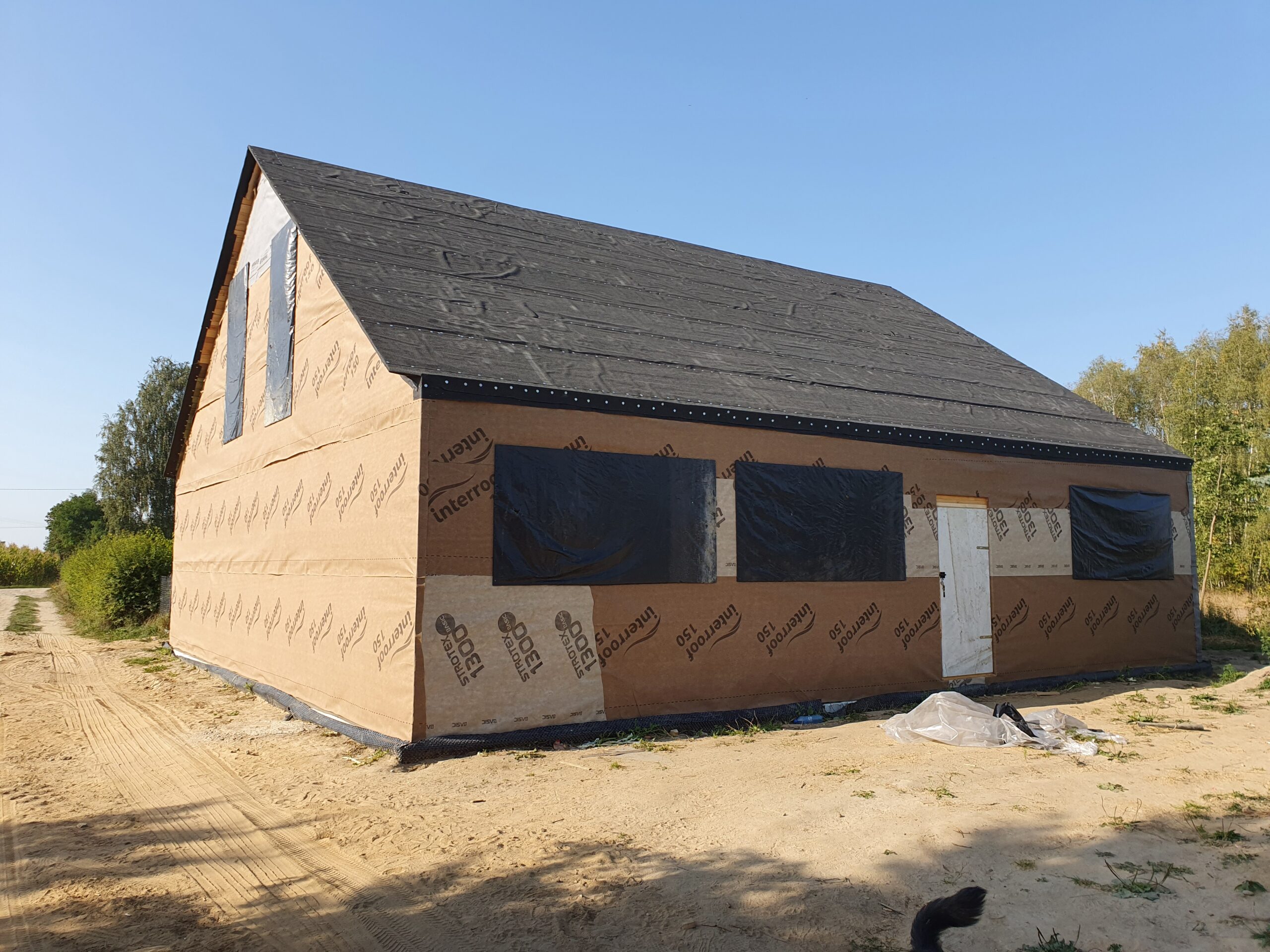 👉 Dach z pokryciem, okna i drzwi – dom jest suchy i zabezpieczony.